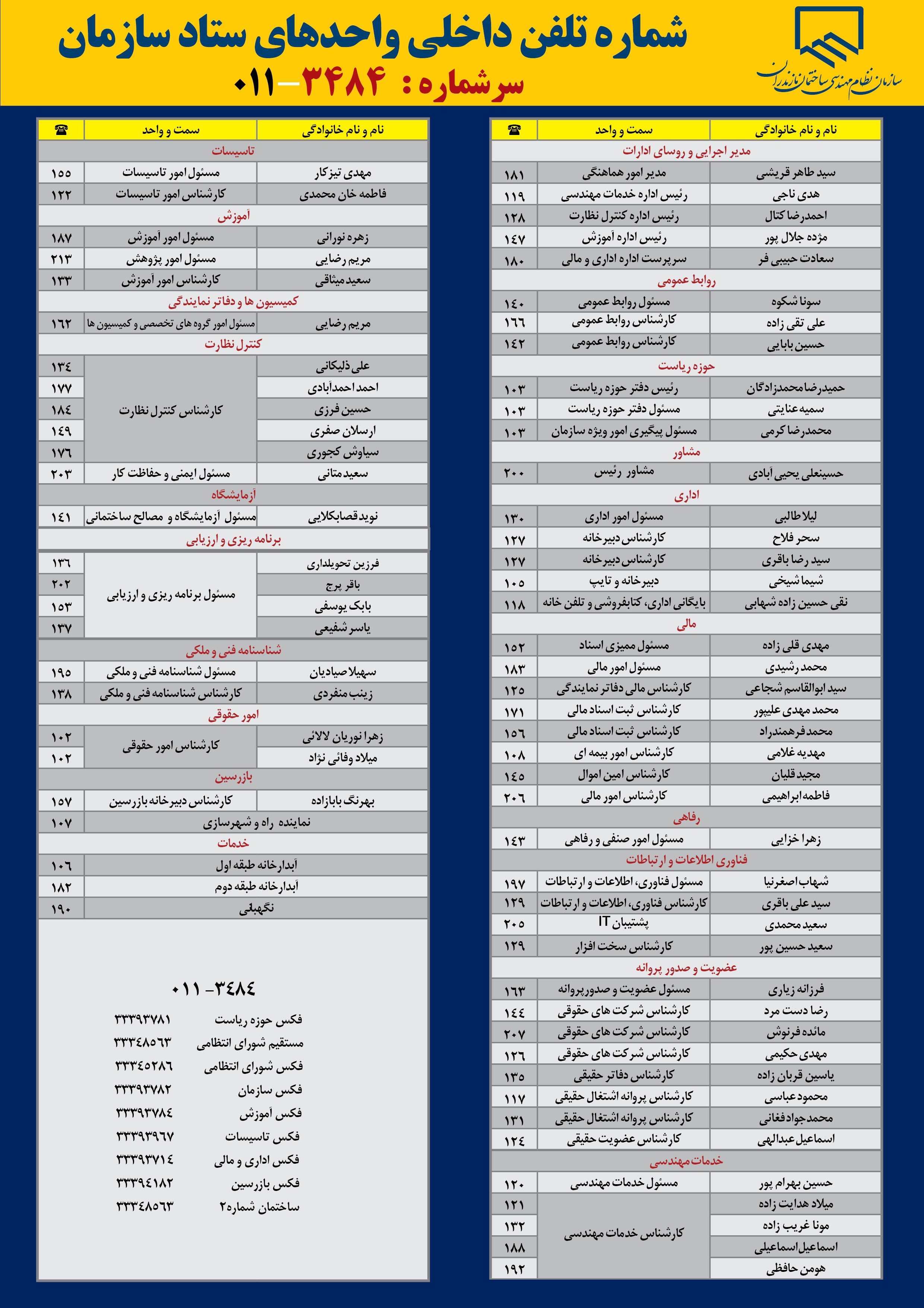 شماره تلفن داخلی واحدهای ستاد سازمـان