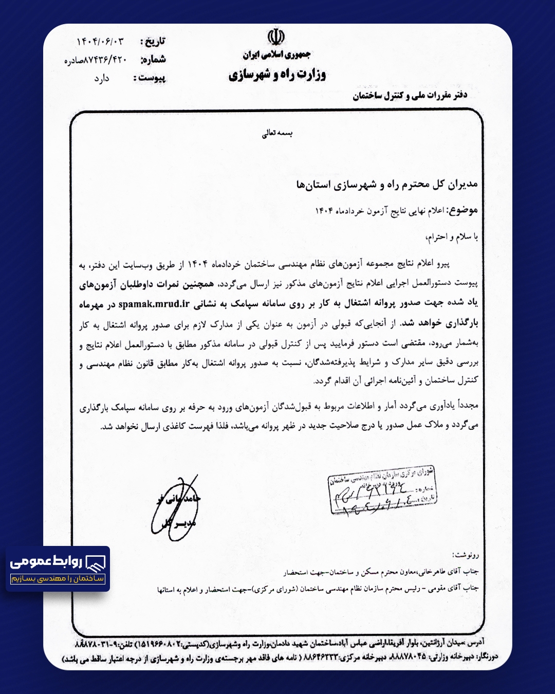 دفتر مقررات ملی و کنترل ساختمان: نمرات داوطلبان آزمون‌های نظام مهندسی ساختمان خرداد۱۴۰۴، جهت صدور پروانه اشتغال به کار، در مهرماه بر روی سامانه سپامک به نشانی spamak.mrud.ir بارگذاری خواهد شد.