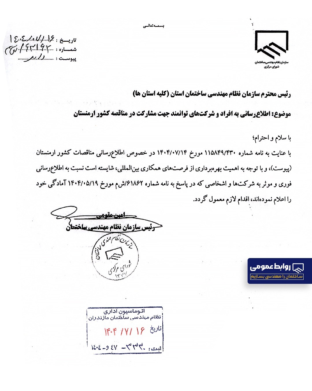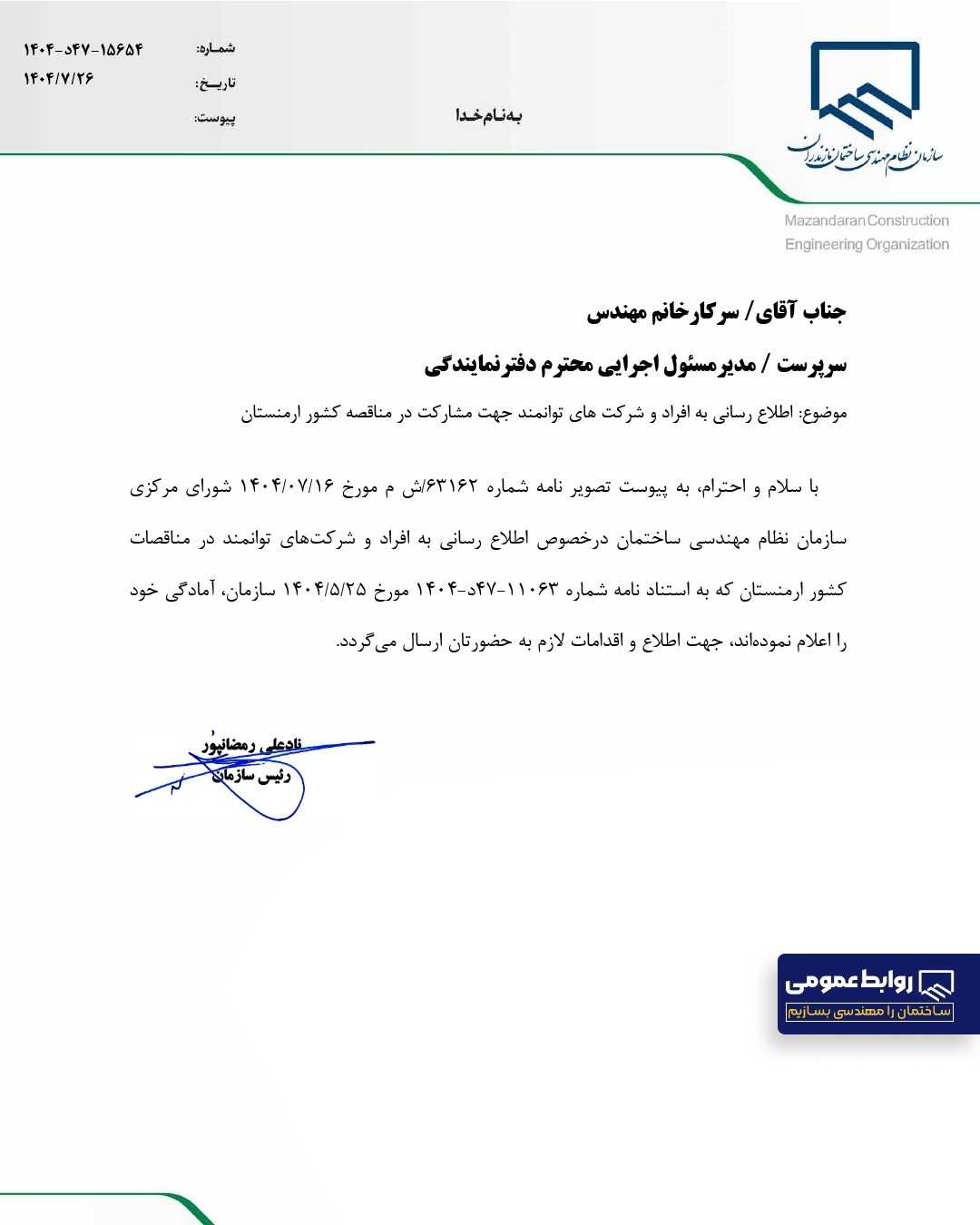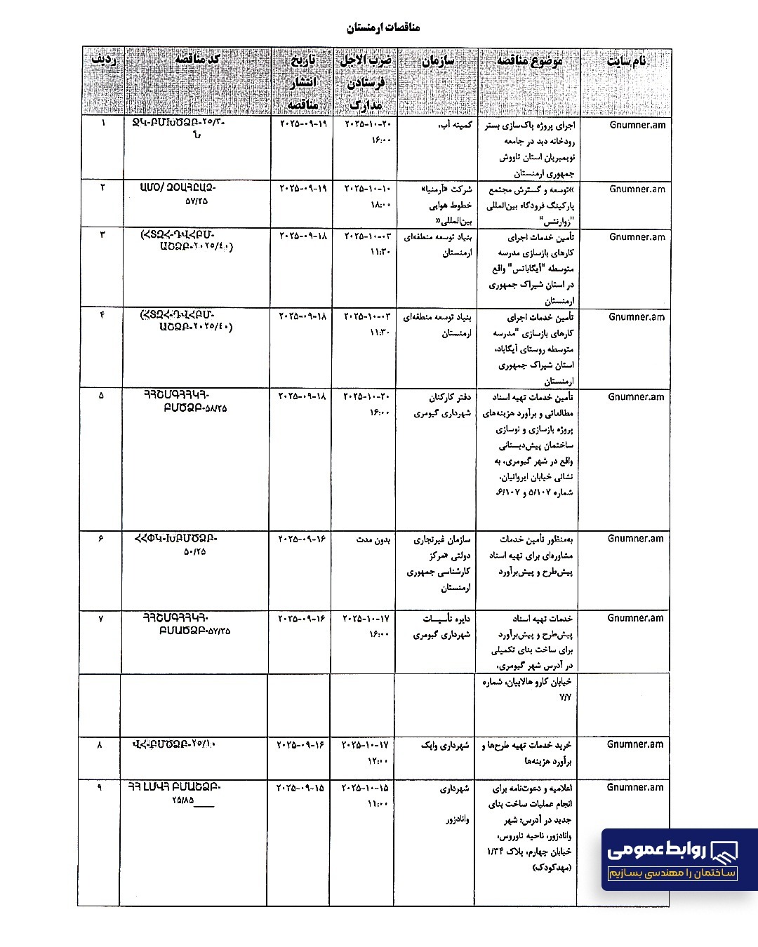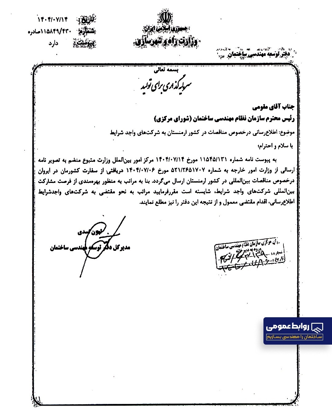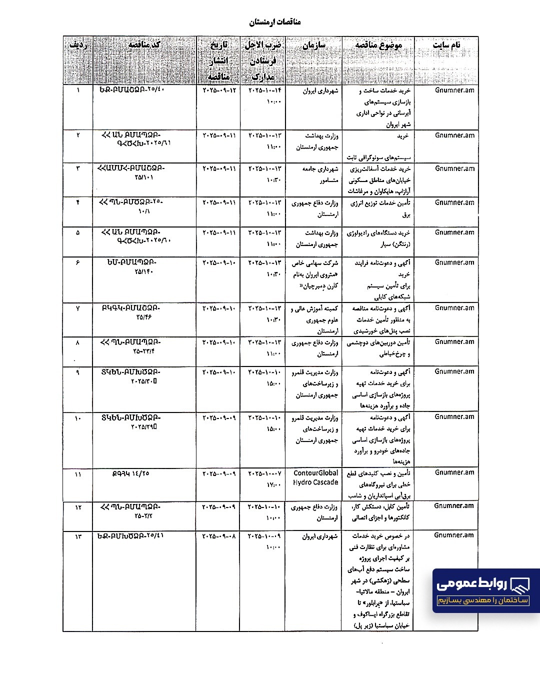 اطلاع رسانی به افراد و شرکتهای توانمند جهت مشارکت در مناقصه کشور ارمنستان