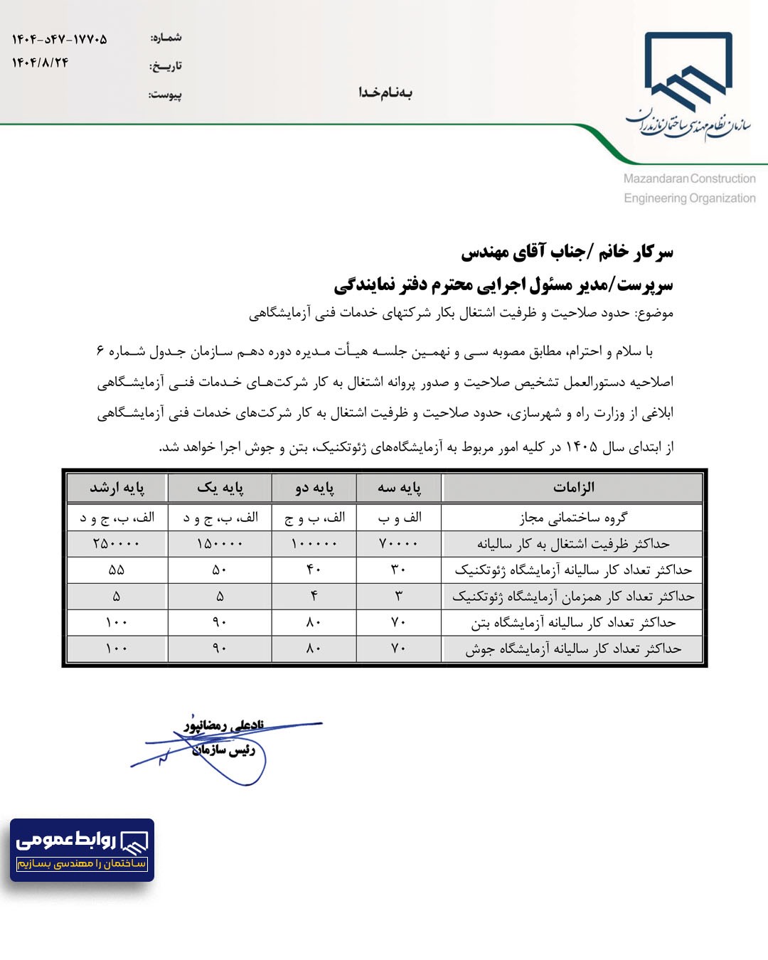 حدود صلاحیت و ظرفیت اشتغال بکار شرکتهای خدمات فنی آزمایشگاهی