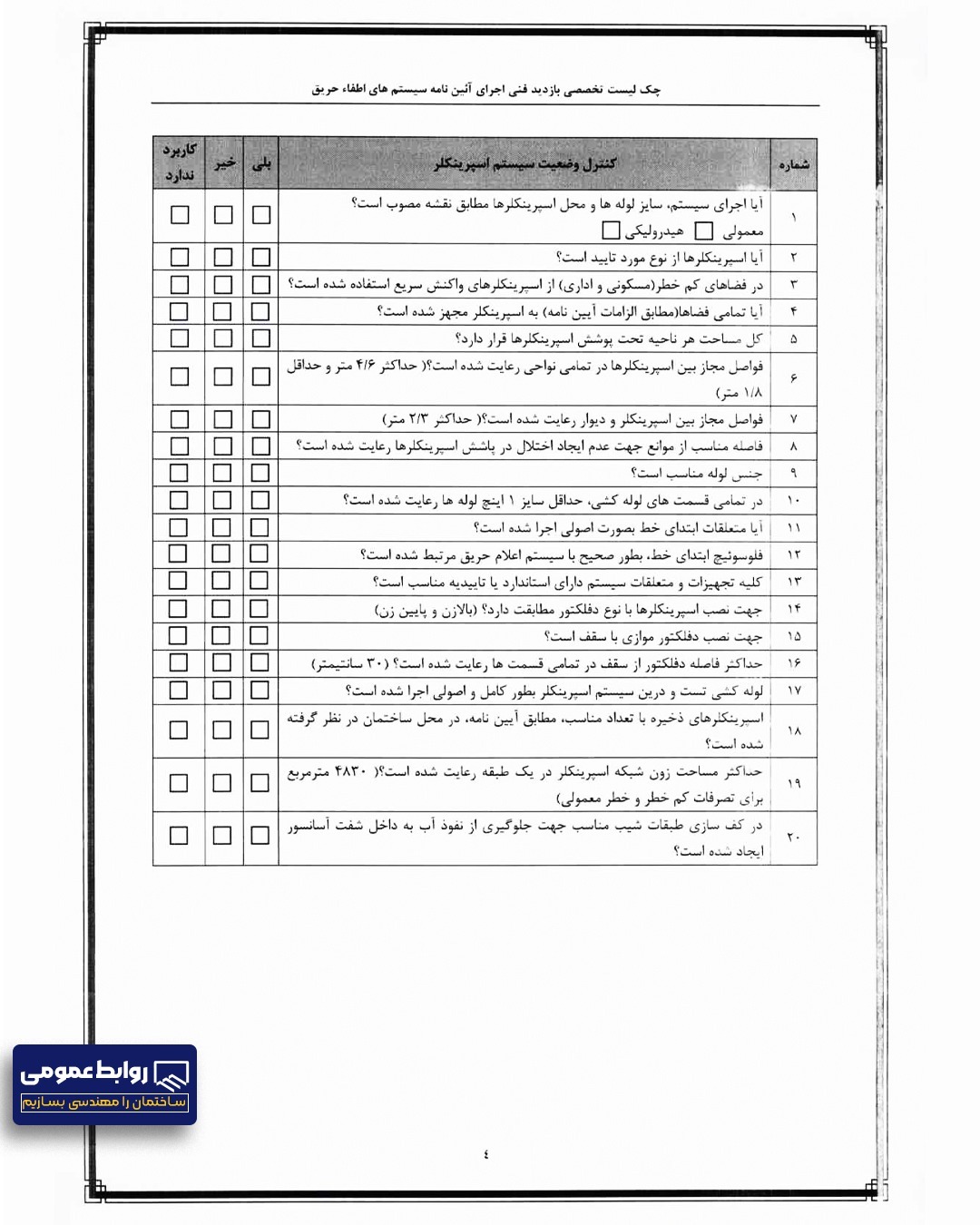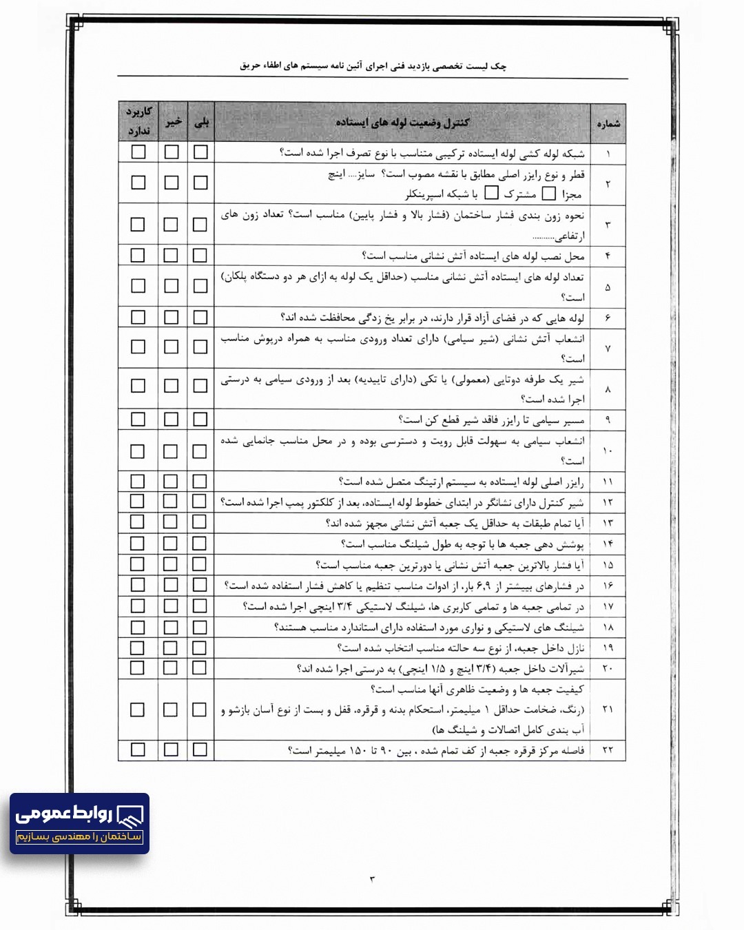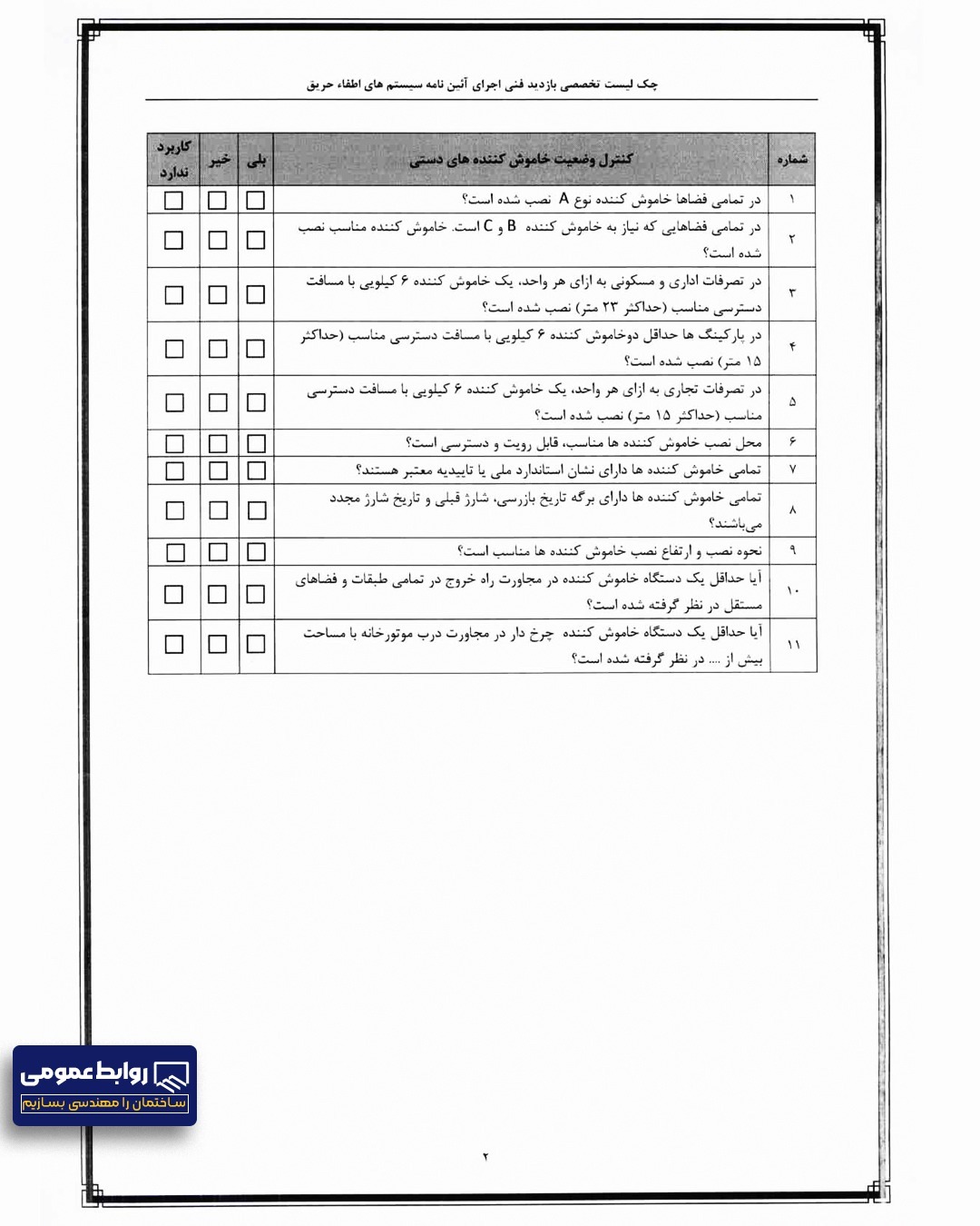 چک لیست و ضوابط آتش نشانی