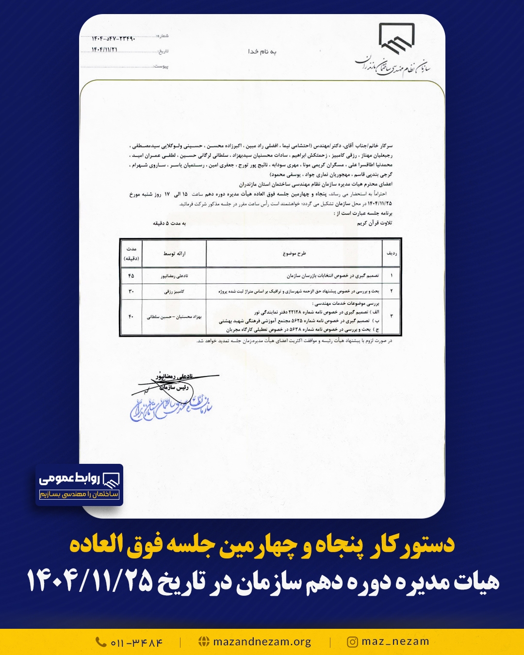 دستورکار پنجاه و سومین جلسه (فوق العاده) هیأت مدیره دوره دهم